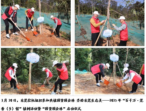 3月20日,东莞信托参加“共植国资国企林 齐绘东莞生态美”2025年“百千万莞香(乡)情”植树活动暨“国资国企林”启动仪式。国资国企林位于同沙生态公园,主要种植莞香、黄花梨、桢楠、活力楠、闽楠和铁刀木共6种造林树种。植树活动现场,党员干部躬身践行、扶植培土、踩紧压实、抬水灌溉,以饱满的热情投入到播种绿色的行动中,国资国企林的热土上呈现一派热火朝天、干劲十足、奋勇争先的植树造林景象。