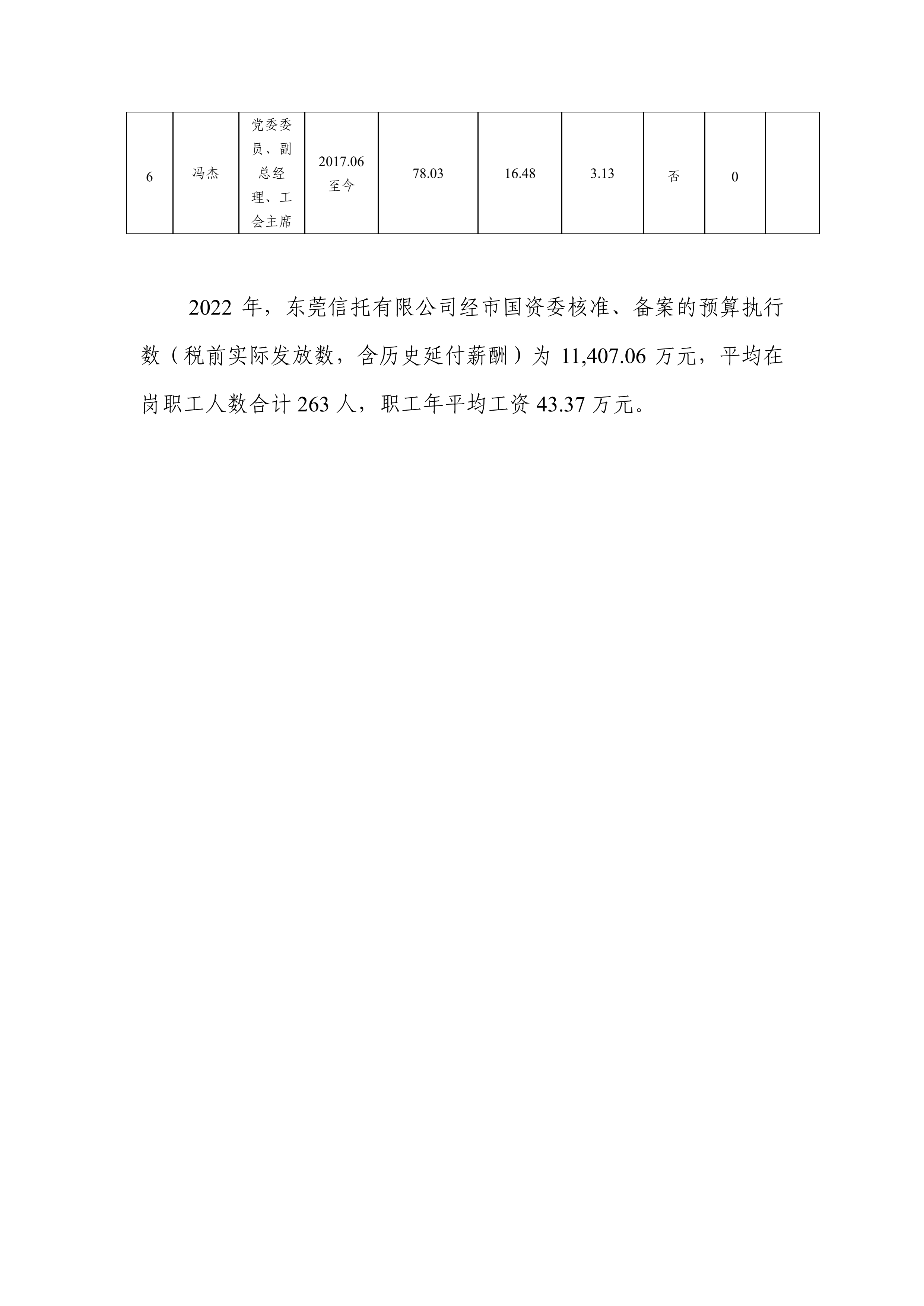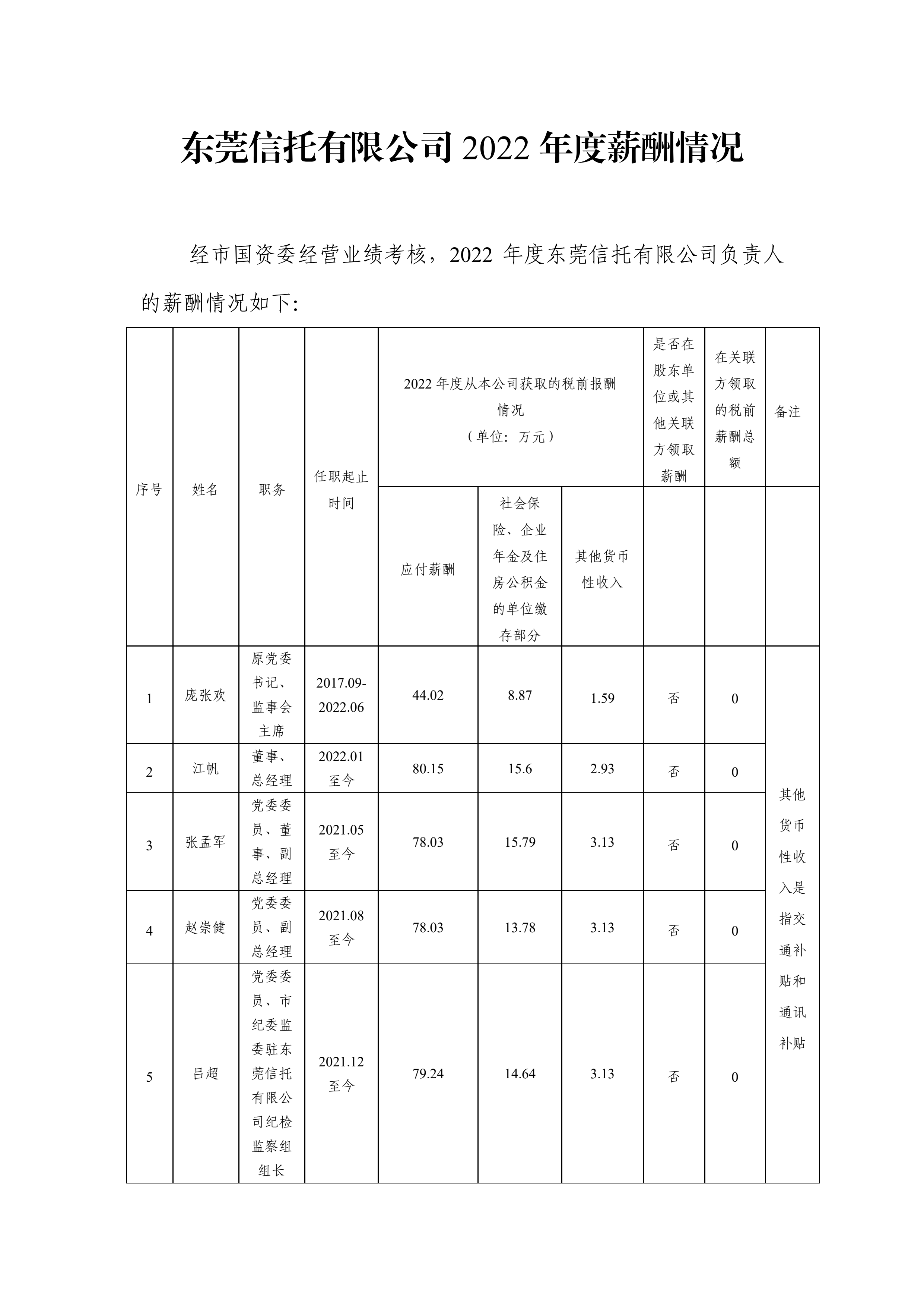 东莞信托有限公司2022年度薪酬情况
